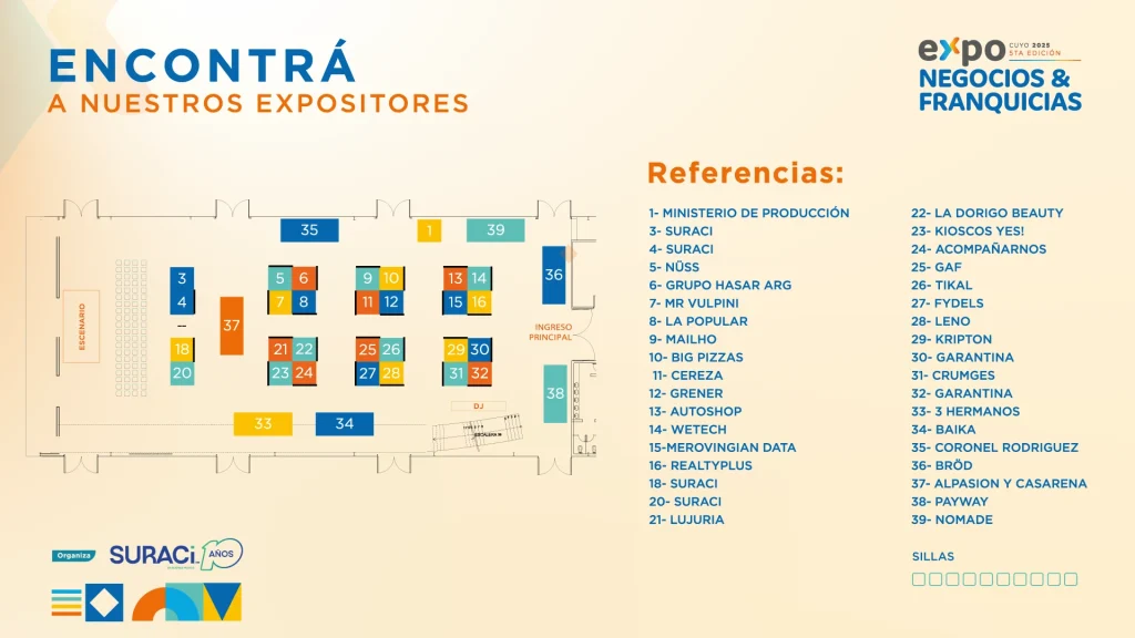 SURACI es una consultora con más de 10 años de trayectoria especializada en desarrollo de negocios, franquicias y expansión comercial. Como organizadores de la Expo Negocios y Franquicias Cuyo 2025, el objetivo es crear un espacio único que potencie la innovación, la inversión y el crecimiento en la región.